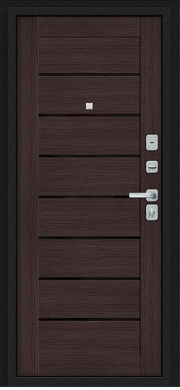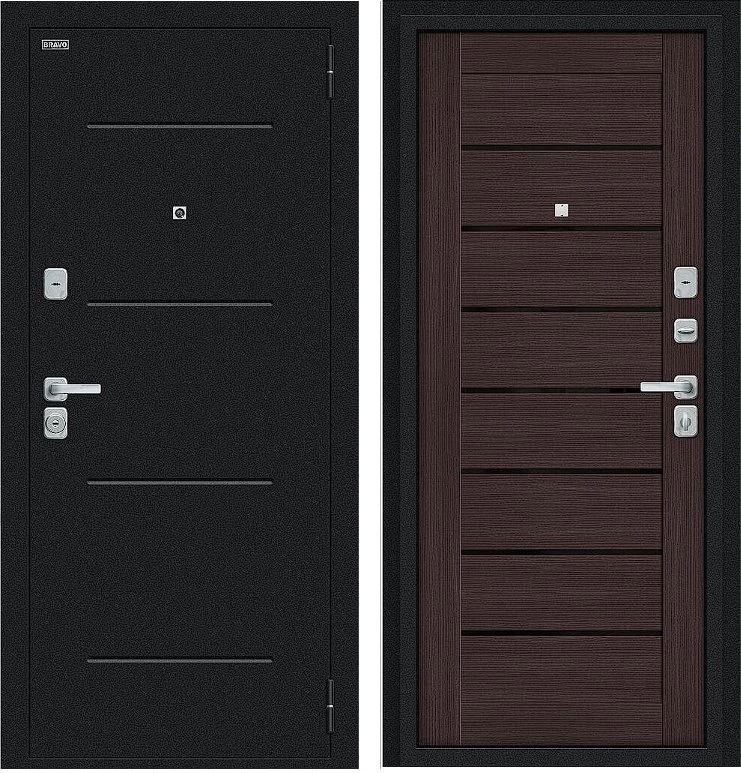 Надежная входная Дверь Браво Техно/BChrome Букле черное/Wenge Melinga премиум класса по цене 33 980 руб. Большая толщина стали защитит от проникновения в ваш дом, квартиру или коттедж. Используется очень качественная фурнитура: замки, цилиндры, ручки, защелки. Покрытие и отделка двери изготовлено под внимательным контролем производителя. Дверь имеет долгий срок службы и гарантию.