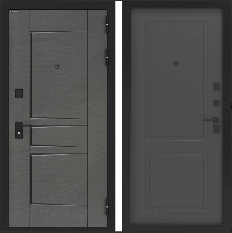 Черная матовая: Броненакладкая, сувальдные накладки со шторкой, ручка, ночник, цилиндр ключ-вертушка, глазок по центру или сбоку